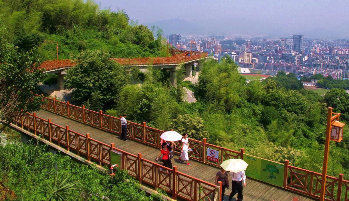 蓮花山底南環(huán)路地面標(biāo)高為330米,山頂標(biāo)高為490.606米,山高160米左右,山頂已開發(fā)為休閑場(chǎng)所,并建有世紀(jì)鐘樓,山腳可挖掘的景點(diǎn)不多,因此決定在半山腰開辟一條市民休閑的木棧道,將公園增加一個(gè)休閑觀光的好場(chǎng)所,并可成為蓮花山一道亮麗的風(fēng)景線。因此在半山腰422米高程建設(shè)一條環(huán)山的木棧道。為盡量少破壞山體植被,木棧道采用棧道橋形式,全長3781.88米,全寬3.5米(包括欄桿寬度),凈寬3.0米,蓮花山棧道橋工程總投資7610萬元。