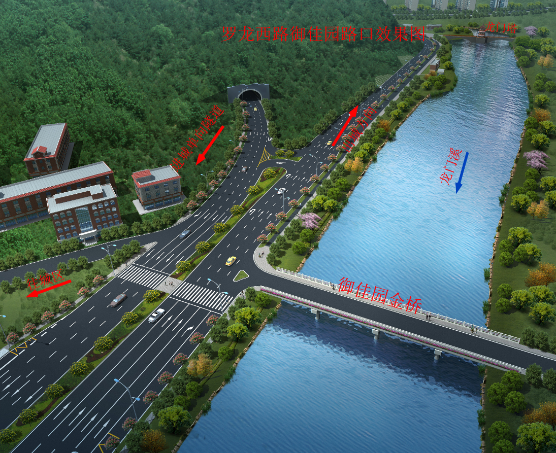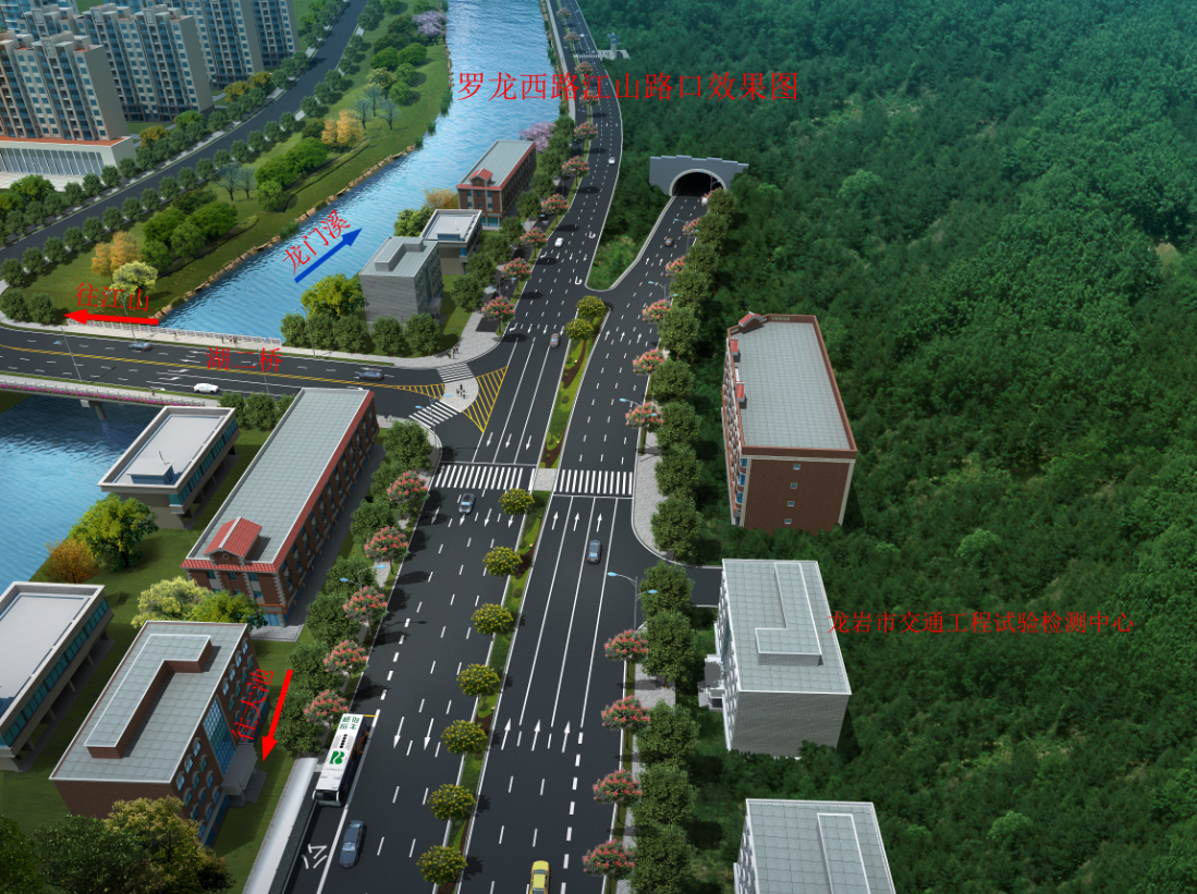 羅龍西路是連接龍巖西高速出入口與中心城市的唯一通道,其規(guī)劃改造范圍從紅竹山橋至御佳園路口,全長3855米,計劃將原道路拓寬至40米,實行雙向六車道,兩旁設2.5米非機動車道,并在湖二橋路口以東設640米入城單向三車道隧道連接至御佳園路口,原羅龍西路湖二橋至御佳園段將調(diào)整為出城單向車道。