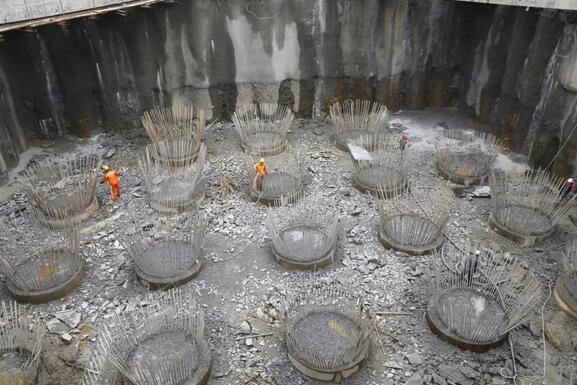 8月24日,繼龍巖大道高架橋主橋主塔樁基、承臺基坑開挖完成后,項(xiàng)目已進(jìn)入主塔承臺施工階段,主橋封底混凝土澆筑完成0.75米(共1.5米),主橋轉(zhuǎn)體關(guān)鍵設(shè)備鑄鋼球鉸已生產(chǎn)完成現(xiàn)場正進(jìn)行樁頭破除作業(yè)。由于連續(xù)橫跨贛龍鐵路、龍廈鐵路、羅龍東路、龍津河、雙洋路,主橋采用不對稱跨塔梁同時(shí)轉(zhuǎn)體施工,其轉(zhuǎn)體總重達(dá)2.366萬噸,轉(zhuǎn)體懸臂173.75m,施工難度巨大。為避免對城市道路及鐵路運(yùn)行的影響,主橋?qū)⒉捎貌粚ΨQ跨塔梁施工并分二次轉(zhuǎn)體,下一步進(jìn)行控制性工程為兩次主塔轉(zhuǎn)體施工。